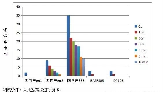 DP-106 在0.1%的活性物含量時(shí)在40℃以上幾乎無泡,并且可以有效的抑制體系的泡沫產(chǎn)生。
