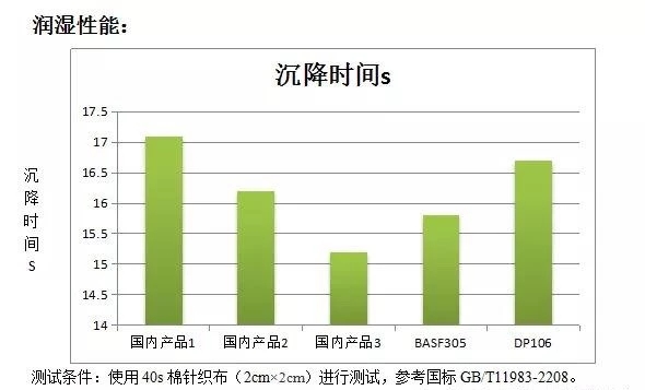 DP-106 具有很好的潤(rùn)濕滲透能力,在0.1%的活性物含量時(shí)潤(rùn)濕滲透時(shí)間為7秒以內(nèi)