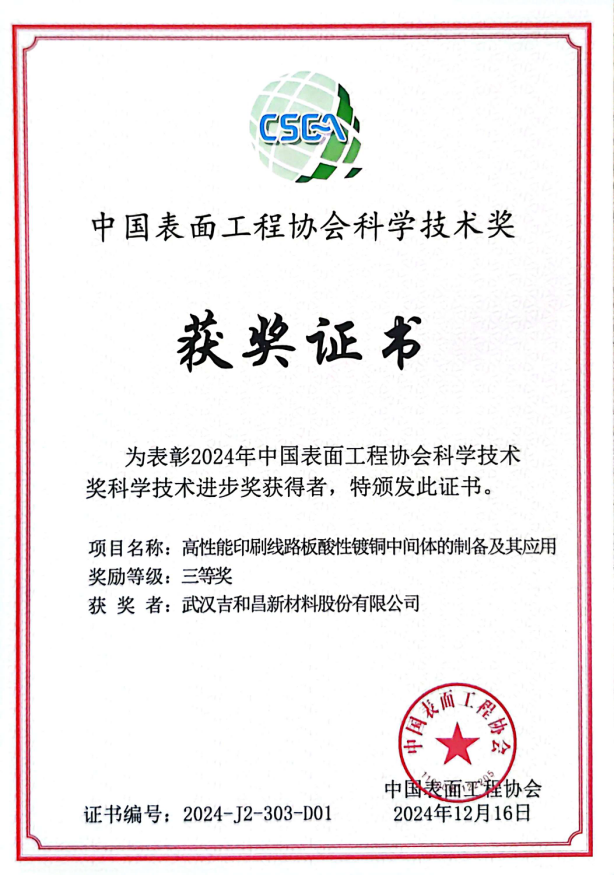 “ProSF 2025國(guó)際表面工程展覽會(huì)”與“中國(guó)表面工程行業(yè)年會(huì)暨高峰論壇”于2025年7月16日至18日在上海新國(guó)際博覽中心舉辦。會(huì)議期間,還舉行了2024年度中國(guó)表面工程協(xié)會(huì)科學(xué)技術(shù)獎(jiǎng)的頒獎(jiǎng)儀式。武漢吉和昌新材料股份有限公司憑借“高性能印刷線路板酸性鍍銅中間體的制備及其應(yīng)用”項(xiàng)目,榮獲科學(xué)技術(shù)進(jìn)步獎(jiǎng)三等獎(jiǎng)。