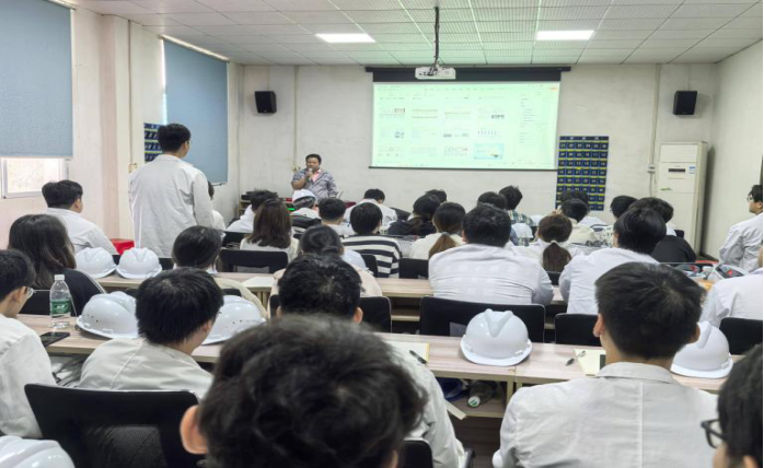 實(shí)習(xí)當(dāng)天,湖北吉和昌化工科技有限公司生產(chǎn)總監(jiān)滕金梁通過生動的宣講向同學(xué)們展示了公司的發(fā)展歷程、核心業(yè)務(wù)、主營產(chǎn)品以及在行業(yè)內(nèi)的地位。同學(xué)們認(rèn)真聆聽,對公司有了初步而深刻的印象,也對接下來的現(xiàn)場參觀充滿了期待。